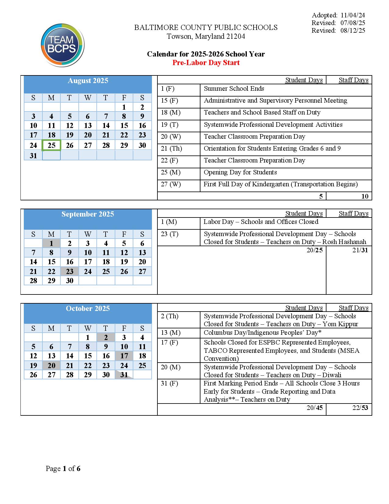 Baltimore County Public Schools Calendar 25 26 Revised PDF EduCounty
