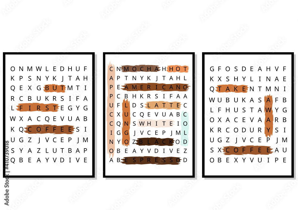 Three posters Crossword puzzle with words related to coffee Cafe