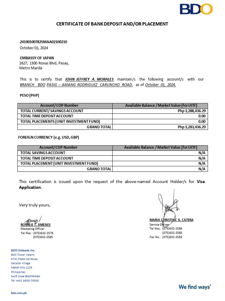 Bdo Bank Certificate PDF