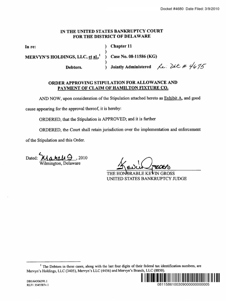 Re:) Atr) : IN Baiikruptcy Court District Delaware in Mervyn #39 S Holdings