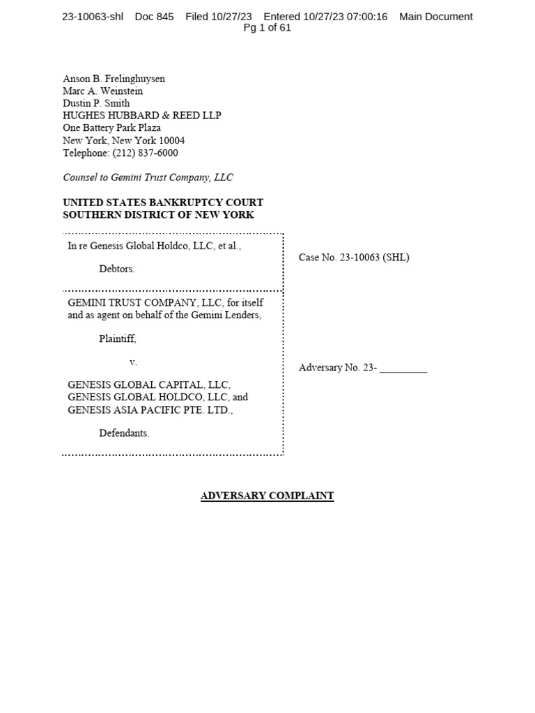 Counsel To Gemini Trust Company LLC: United States Bankruptcy Court