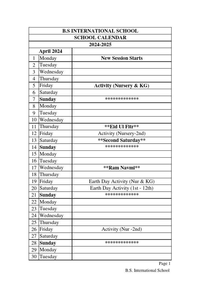 BSIS School Calendar 2024 2025 PDF Entertainment Events Observances