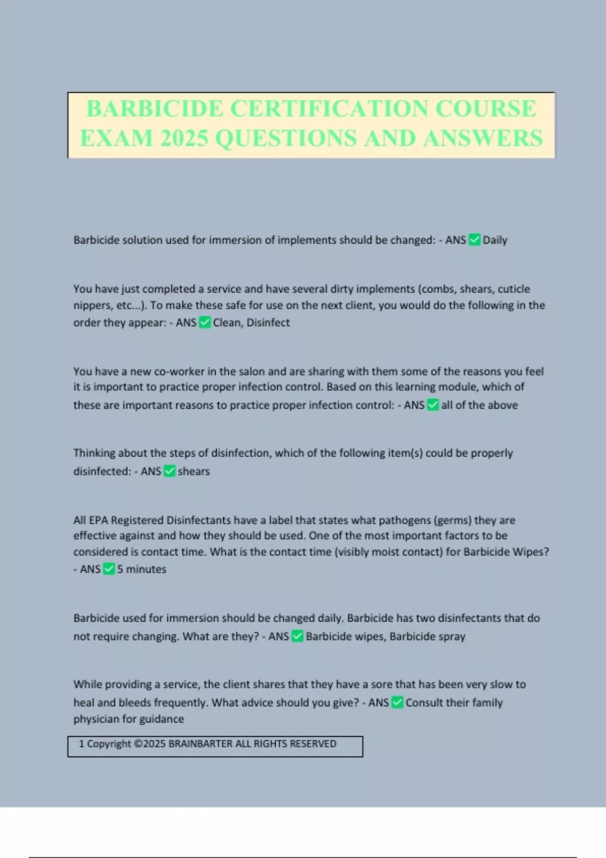 BARBICIDE CERTIFICATION COURSE EXAM 2025 QUESTIONS AND ANSWERS