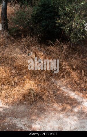 Vertical shot of a barely visible leopard in dried grass Stock Photo