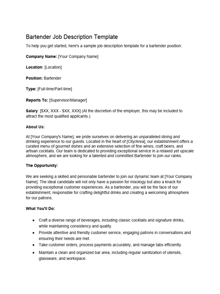 Bartender Job Description TEMPLATE for 2026