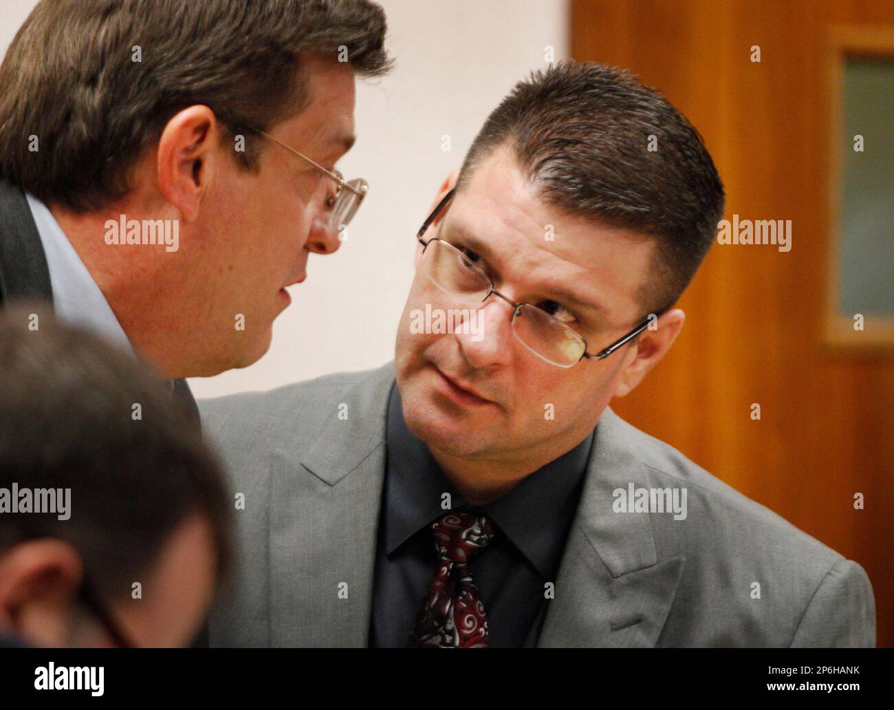 Adam Longoria right talks with his attorney Tim Frieden left during