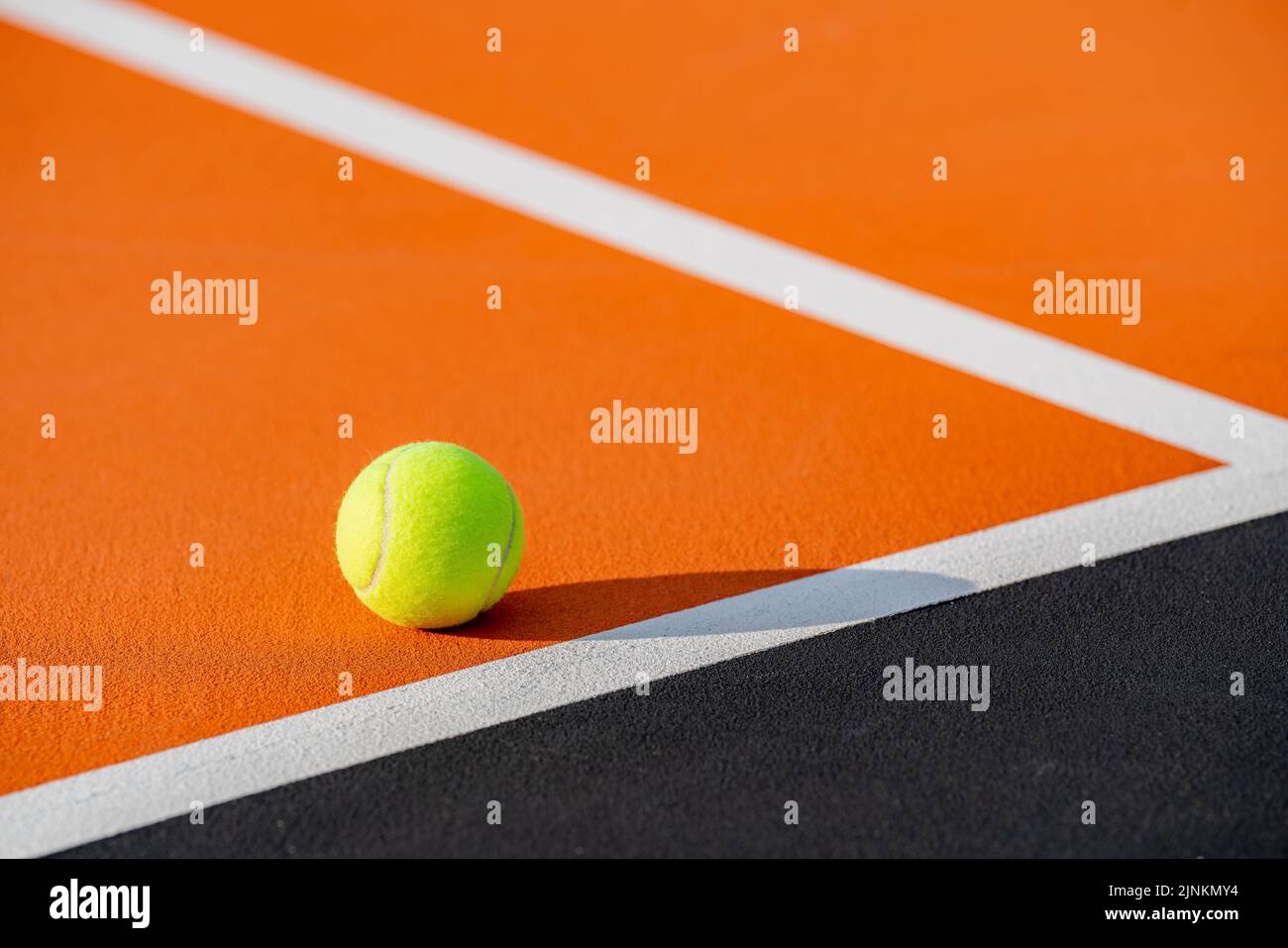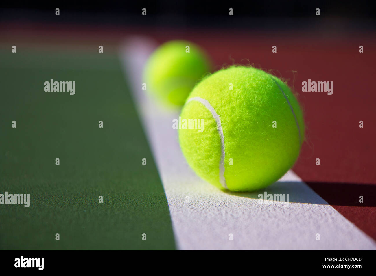 Two tennis balls on baseline of brand new outdoor tennis court Stock