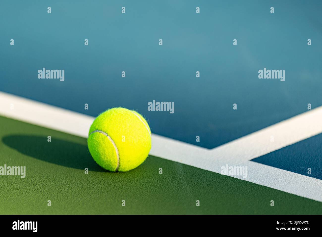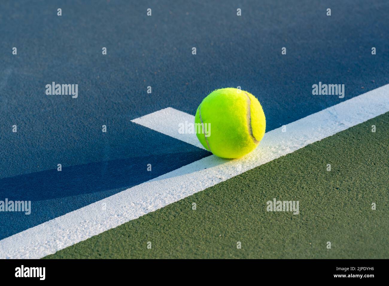 Yellow tennis ball near baseline on a new blue tennis court with green
