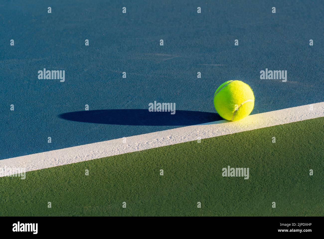 Yellow tennis ball on baseline on a new blue tennis court with green
