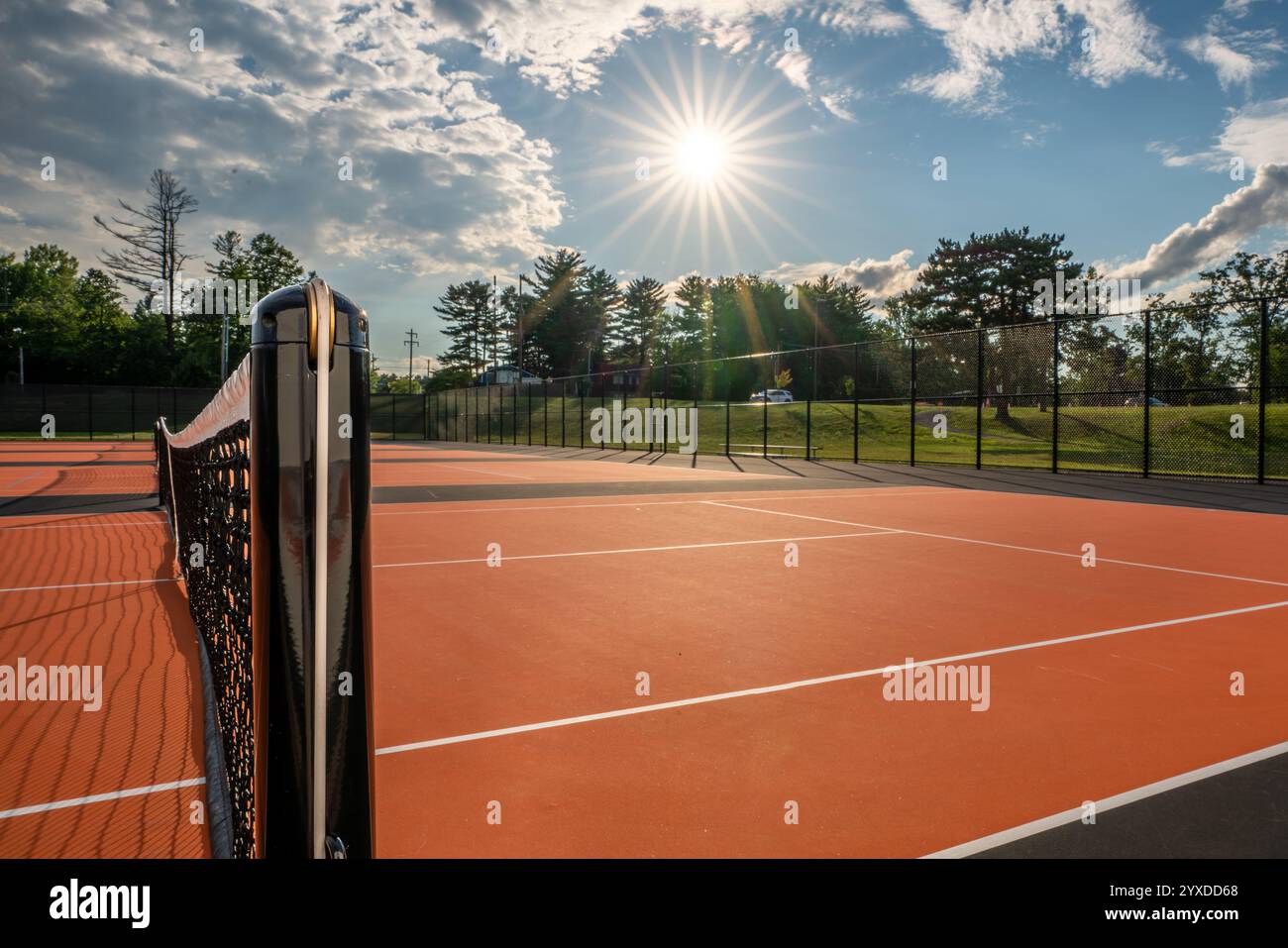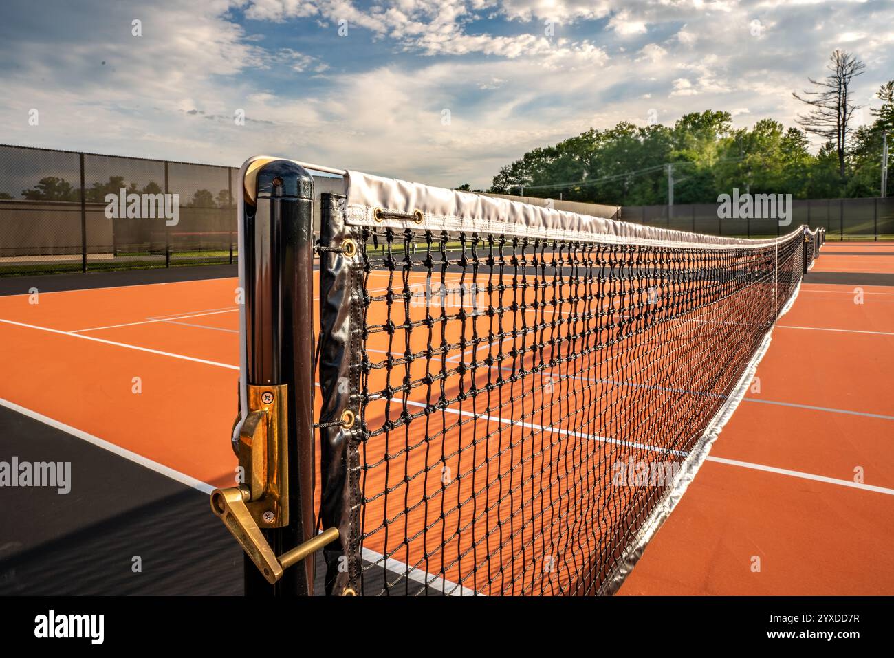 Baseline and net of an empty clay tennis court on a sunny day Stock
