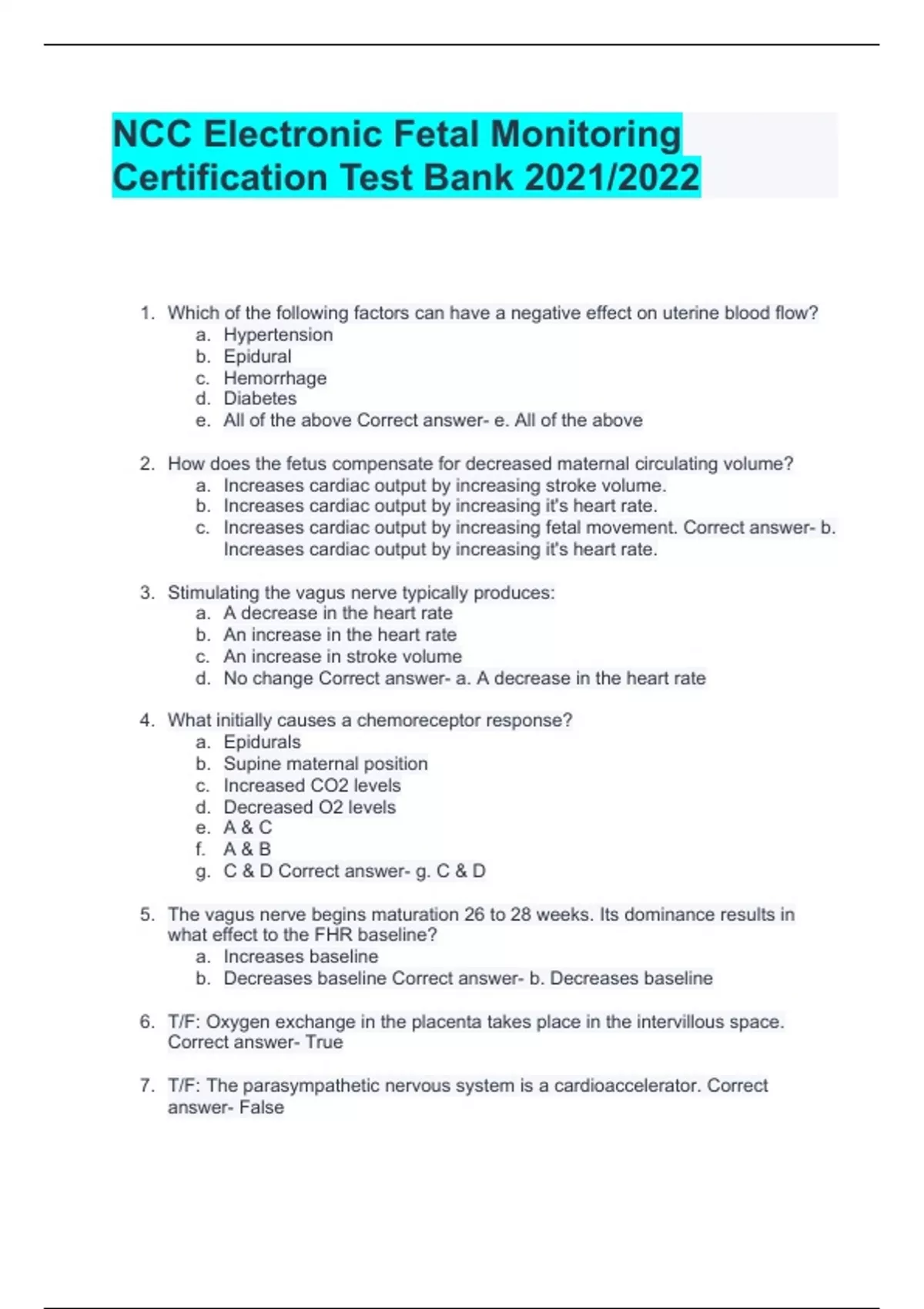 NCC Electronic Fetal Monitoring Certification Test Bank 2021 Nursing