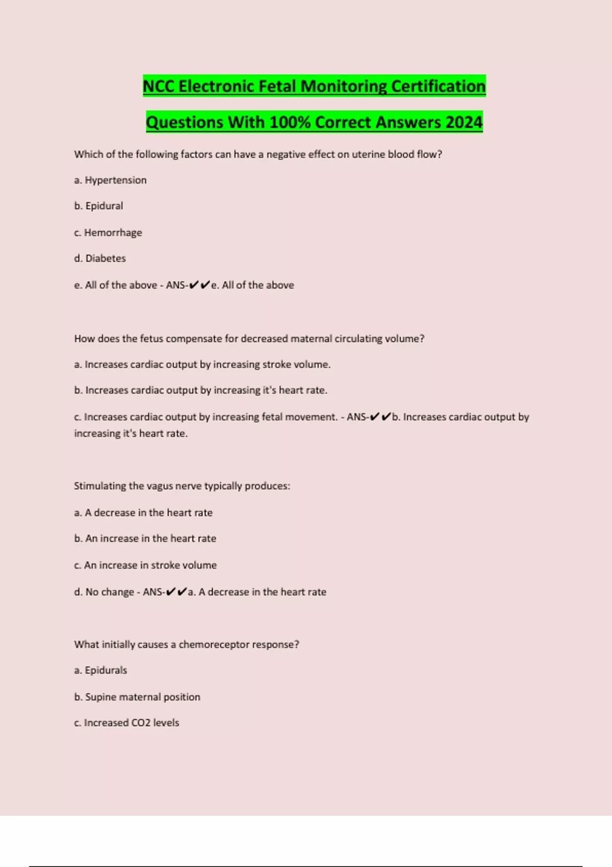 SOLUTION: Ncc electronic fetal monitoring certification exam with 100
