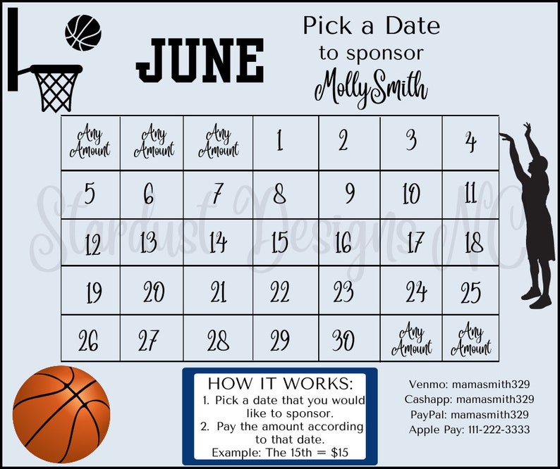 Premium Basketball Pick a Date to Donate Cash Calendar Fundraiser in