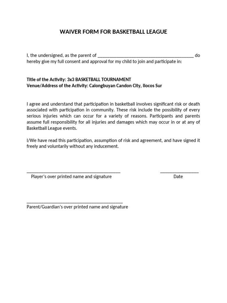 WAIVER FORM FOR BASKETBALL LEAGUE PDF