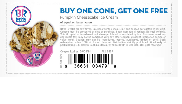 Baskin Robbins coupon A second ice cream cone free at Baskin Robbins