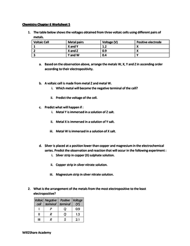 Voltaic Cell Displacement Reaction and Electrolysis (3 Worksheets and