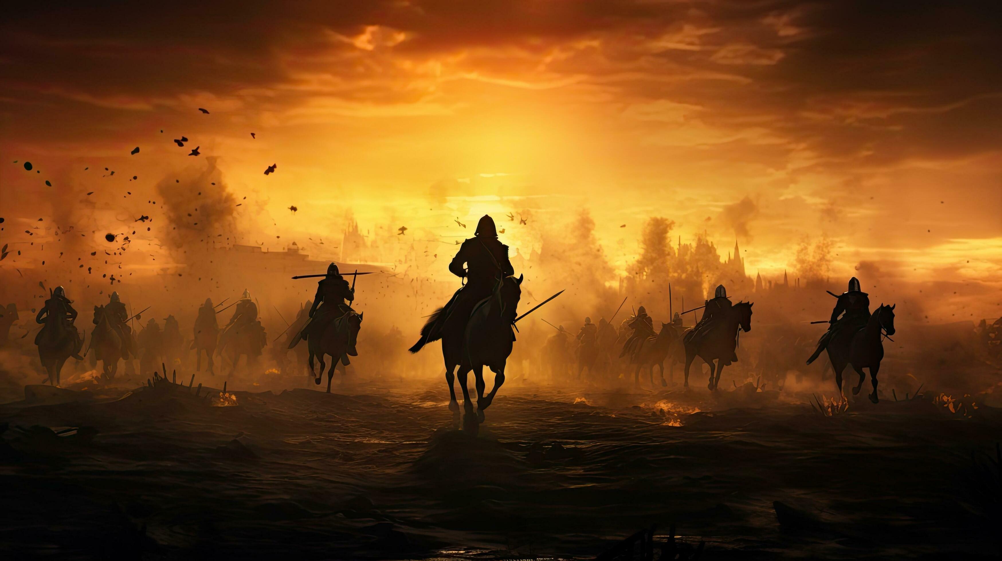Warriors on foggy sunset background fighting in a medieval battle scene