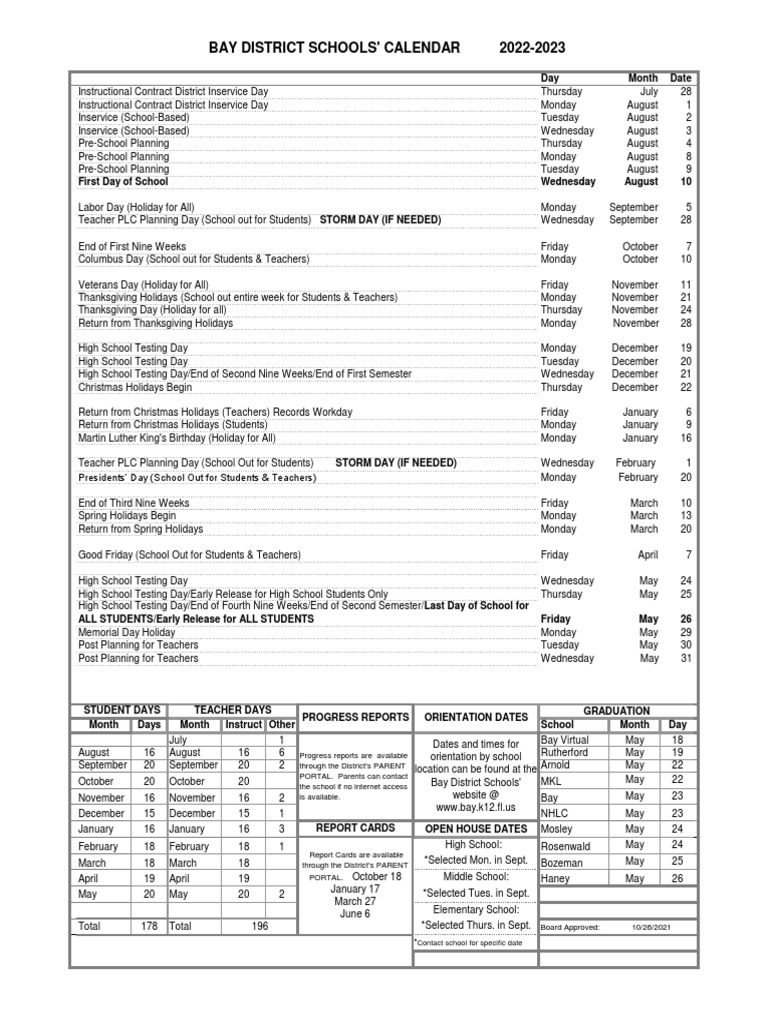 2022 2023 Bay District Schools Calendar Download Free PDF