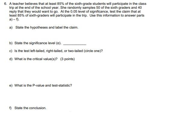 Solved 6 A teacher believes that at least 85% of the Chegg com