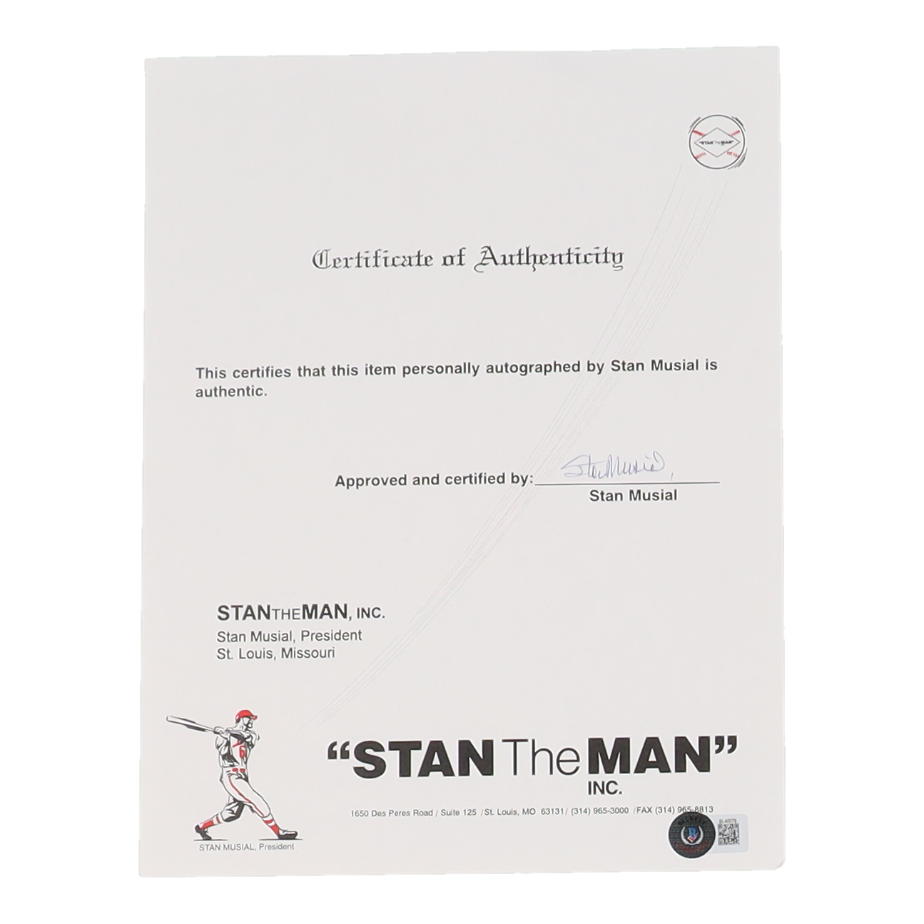 Stan Musial Signed quot Stan the Man quot Certificate of Authenticity (Beckett