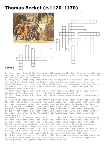 Thomas Becket Crossword by sfy773 Teaching Resources TES