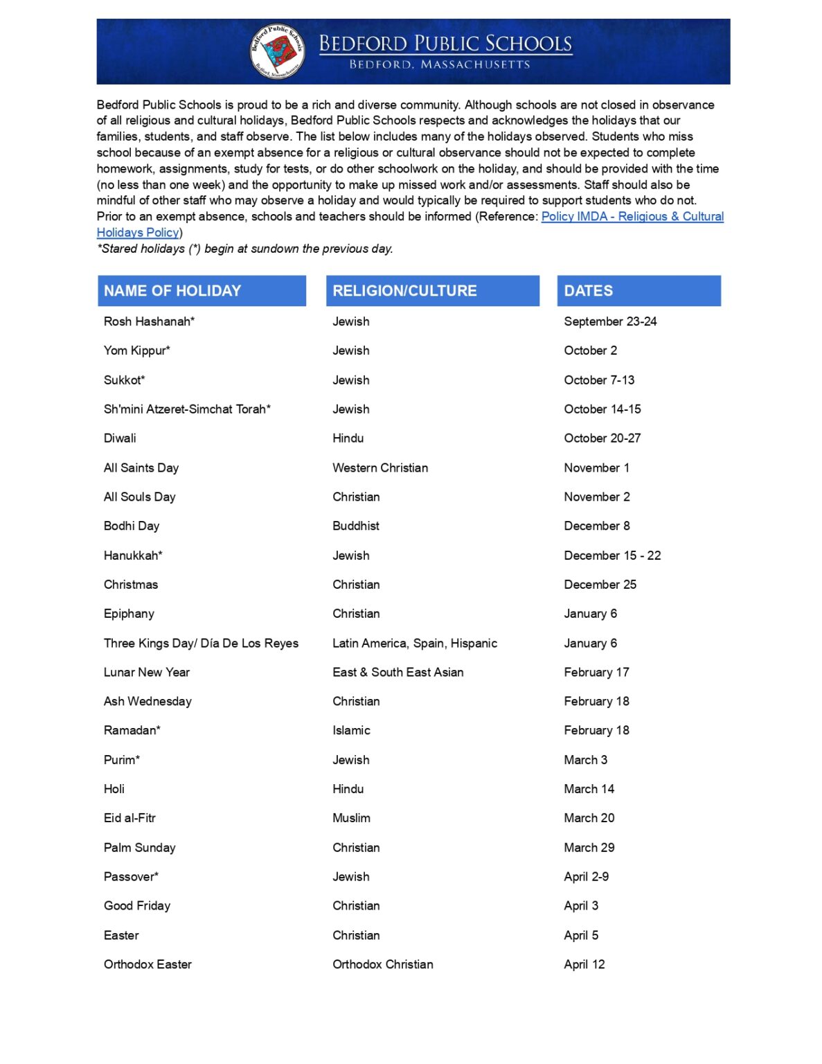Bedford Public Schools Calendar 2024 and 2025 PublicHolidays com