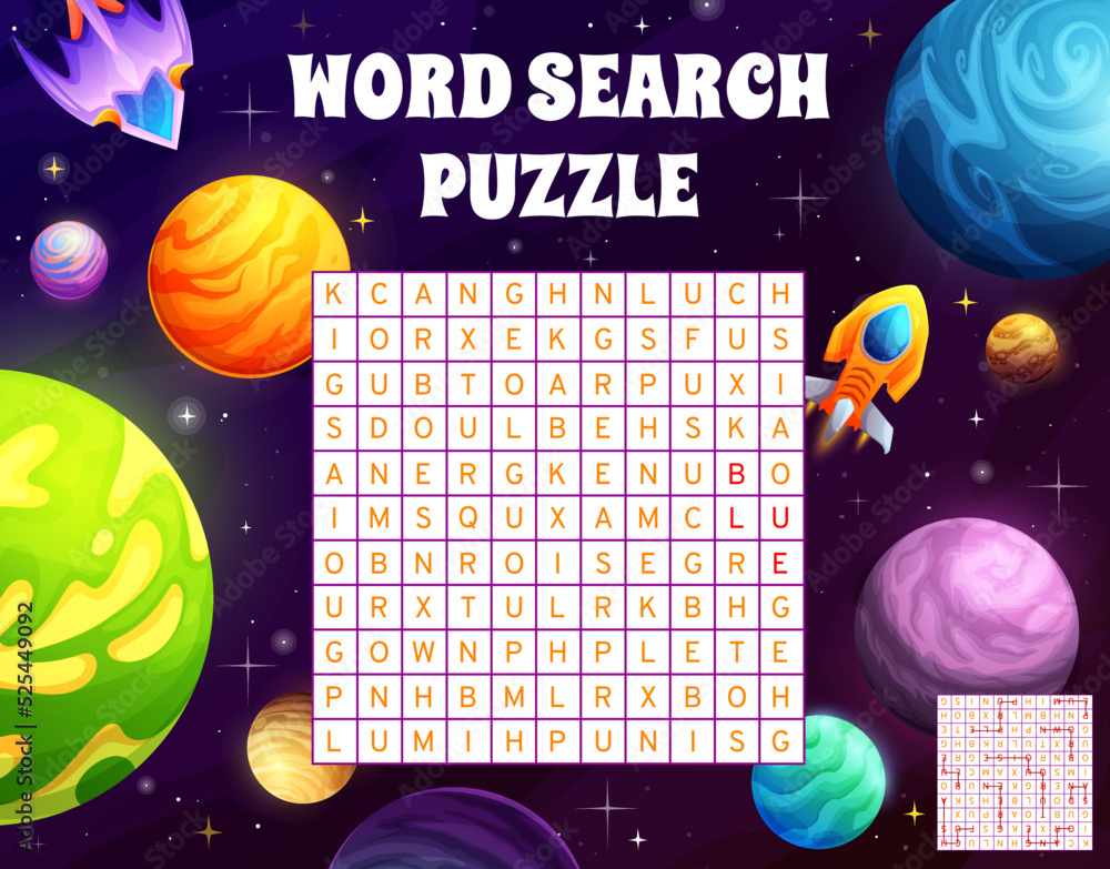 Ilustración de Stock Word search puzzle game worksheet cartoon space