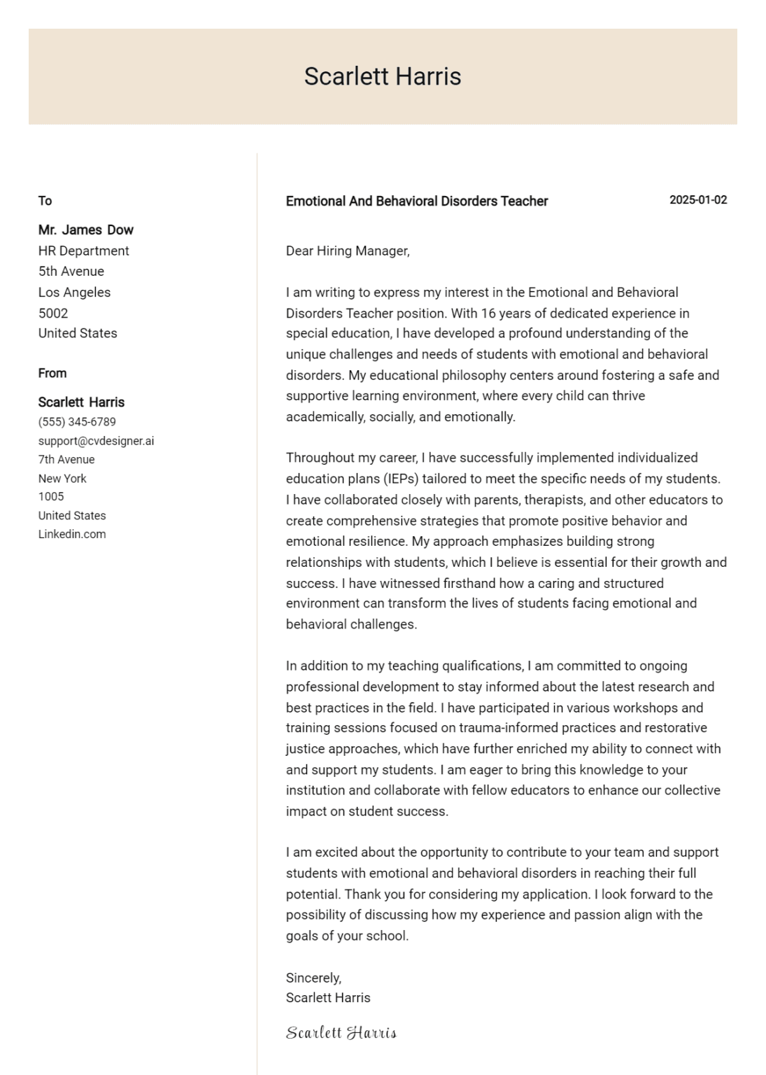 15 Emotional and Behavioral Disorders Teacher Cover Letter Examples And