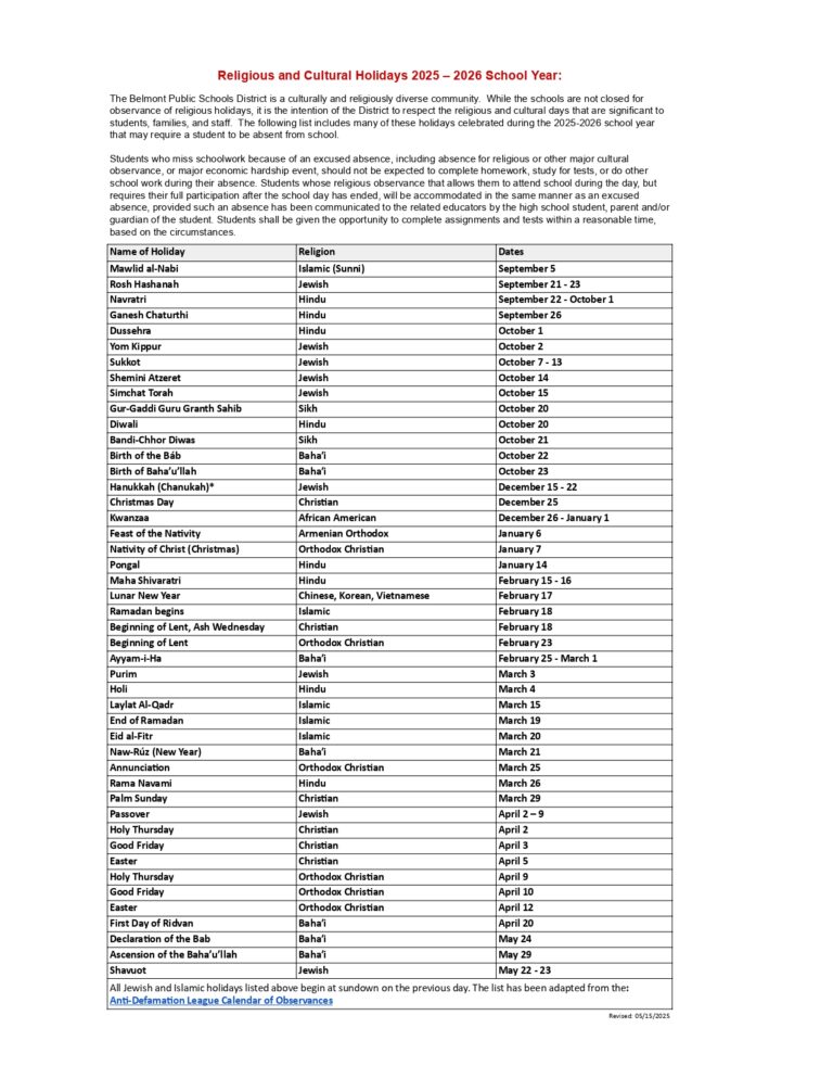 Belmont Public Schools MA Calendar 25 26 Revised PDF EduCounty