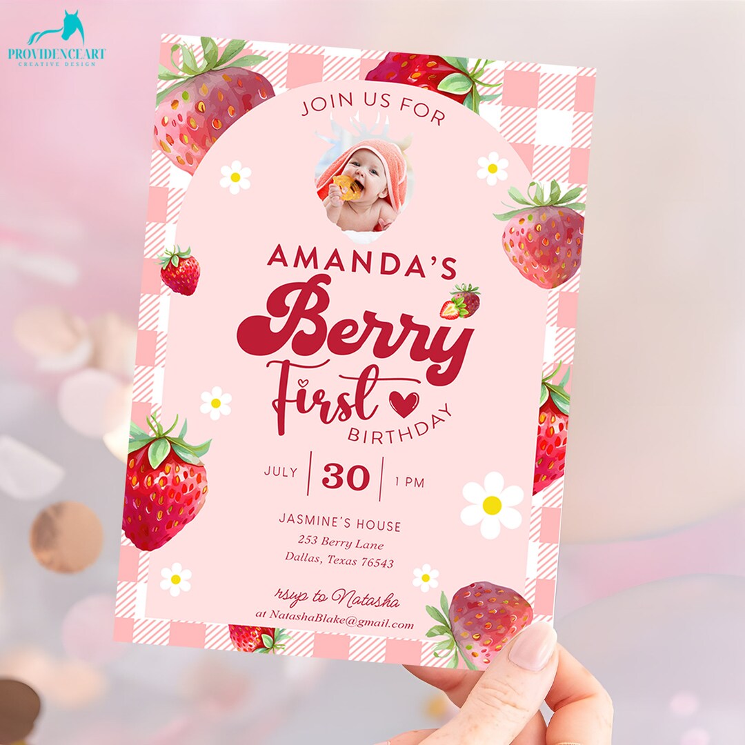 Printable Berry First Birthday Invitation With Picture Strawberry