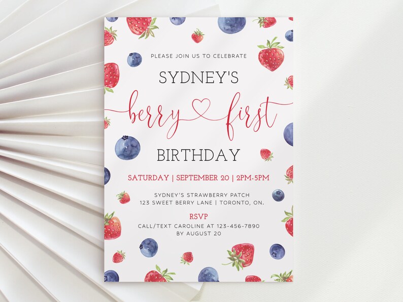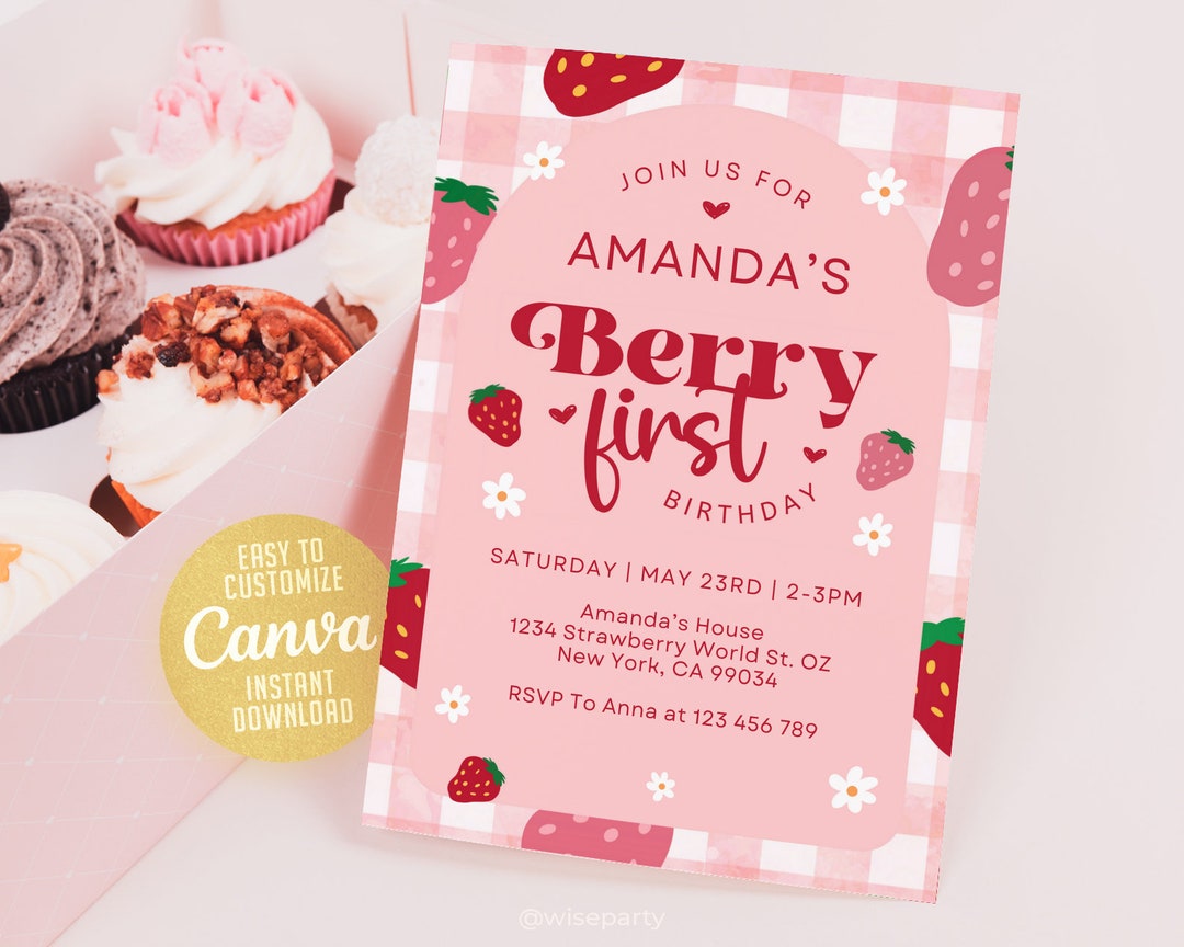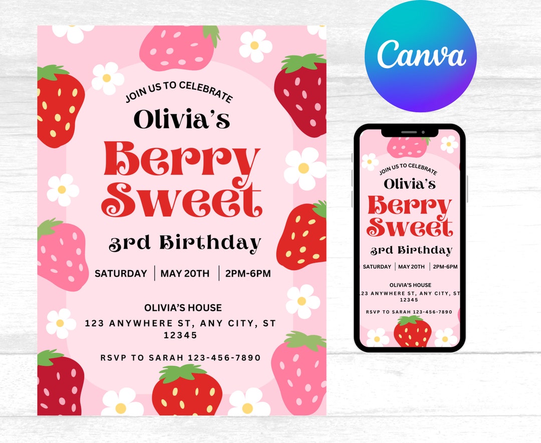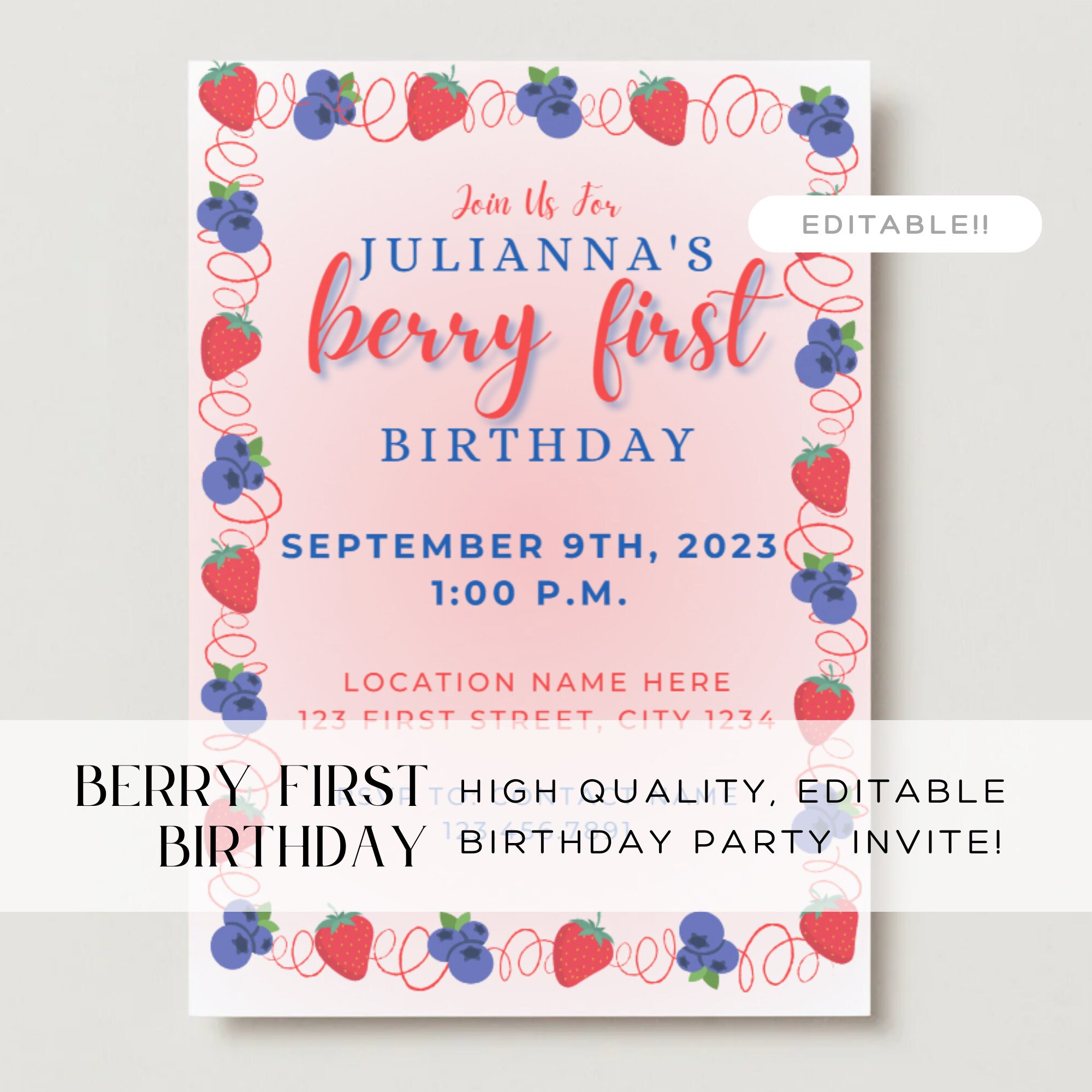 Editable Berry First Birthday Invitation Canva Printable Invitation