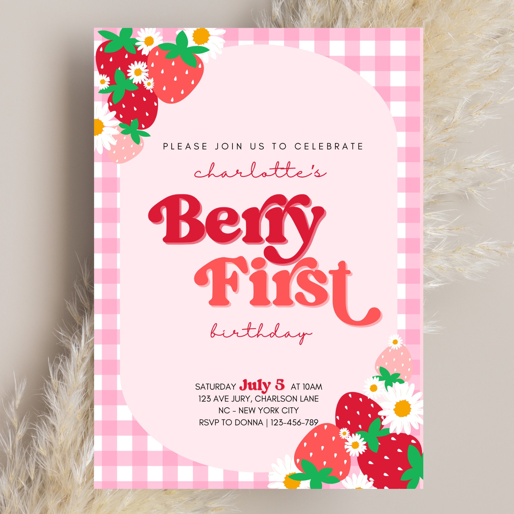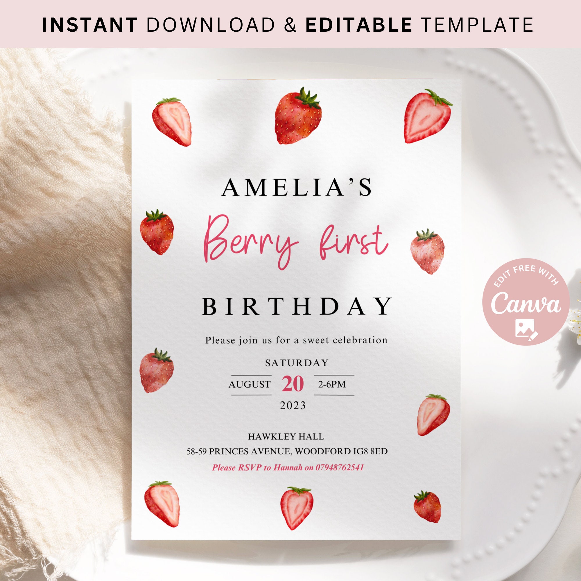 Editable Berry First Birthday Invitation Strawberry Birthday Etsy