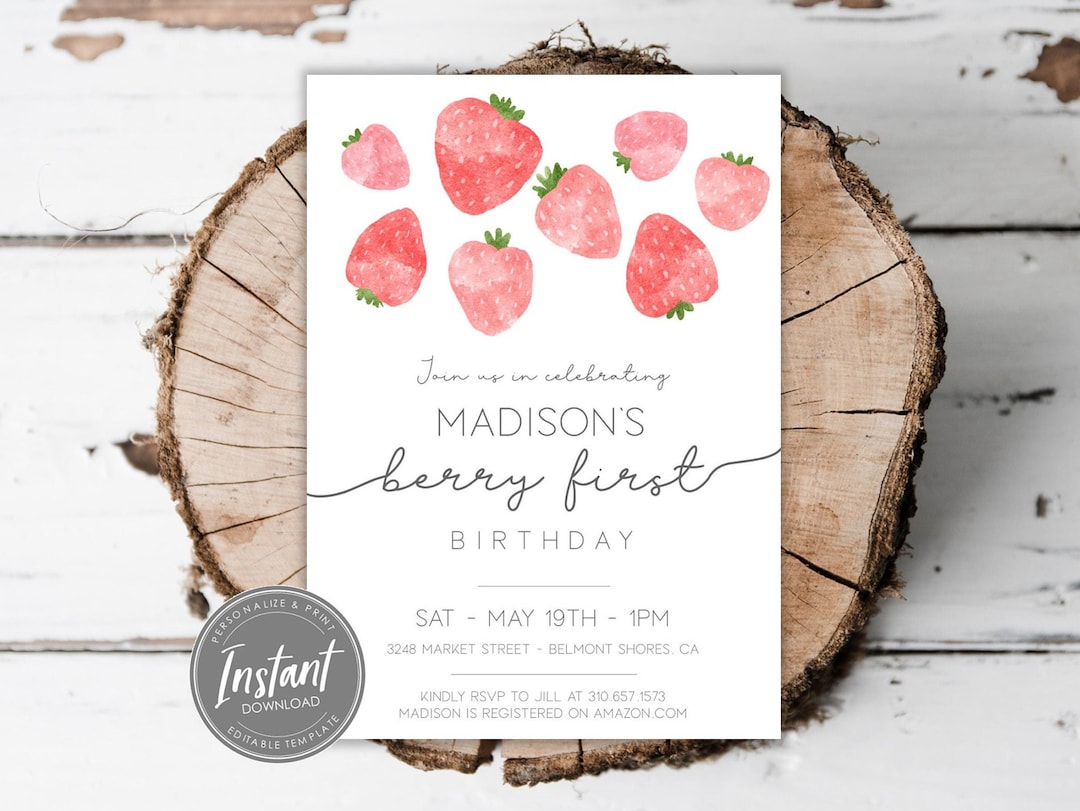 EDITABLE Berry First Birthday Invitation Strawberry Digital Invitation