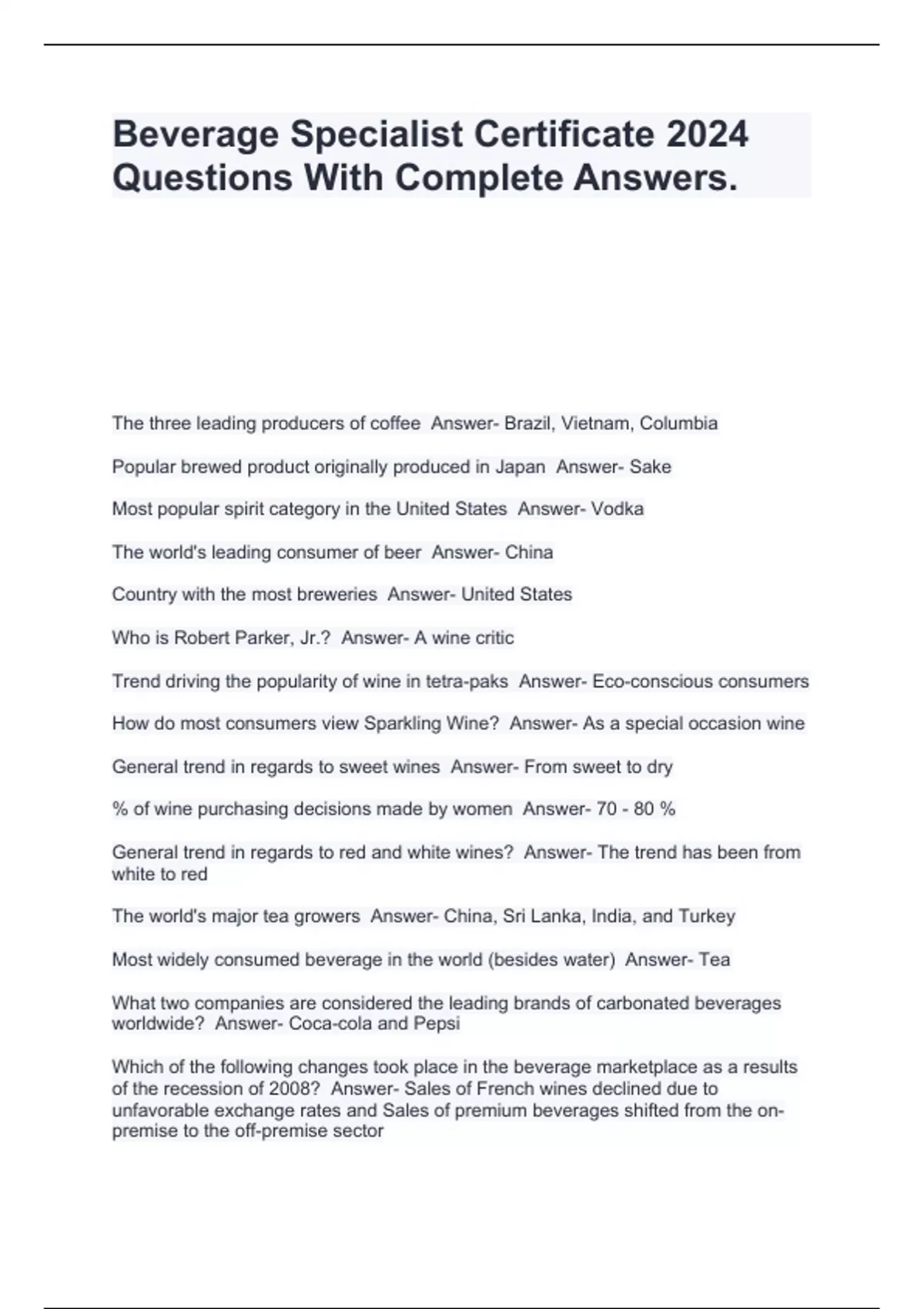 Beverage Specialist Certificate 2024 Questions With Complete Answers