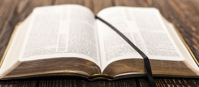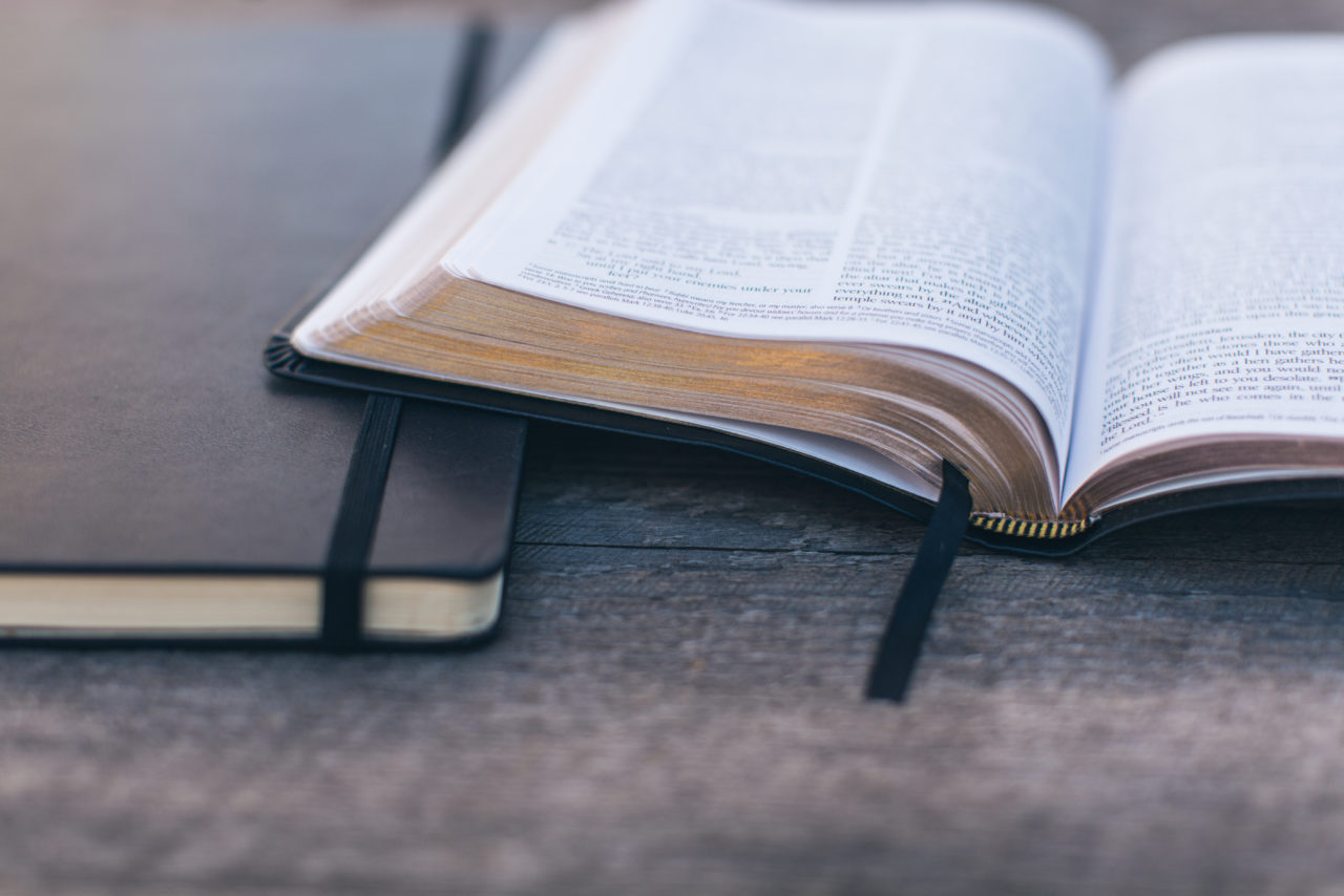 Open Bible on Wooden Table Closeup Christian Religious Book Stock