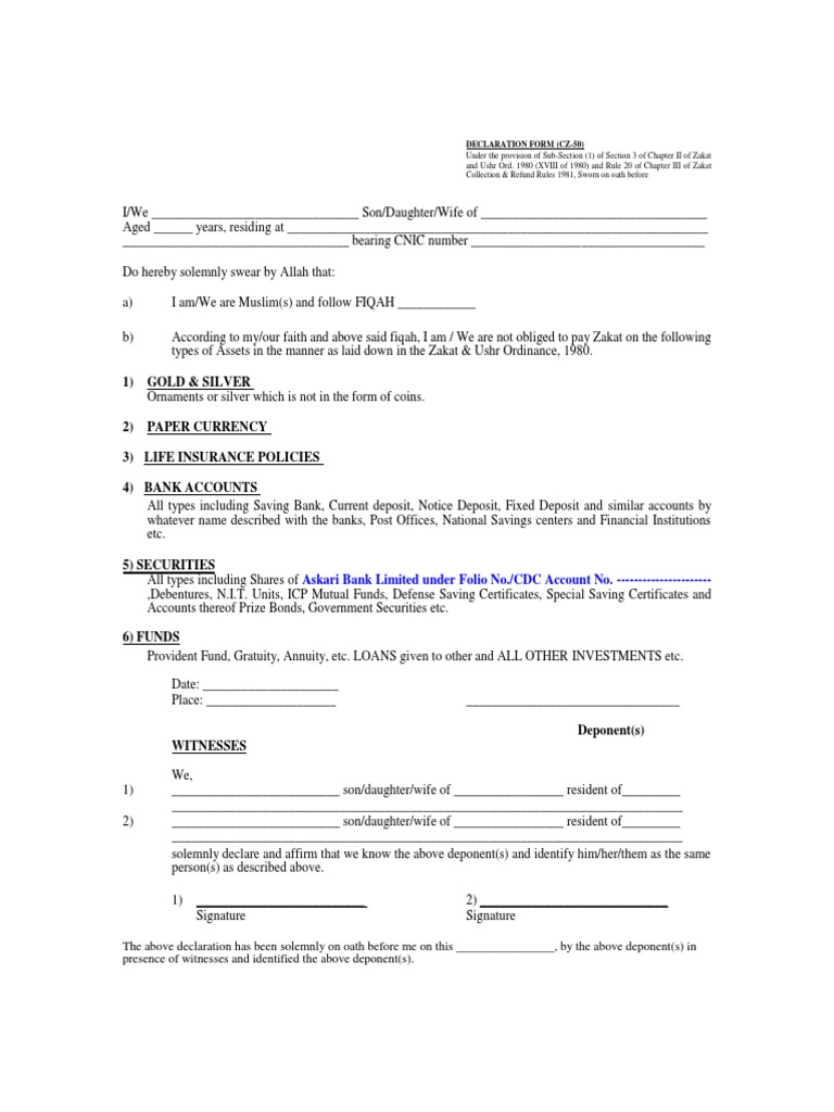 Zakat Declaration Form CZ501 PDF Securities (Finance) Banks