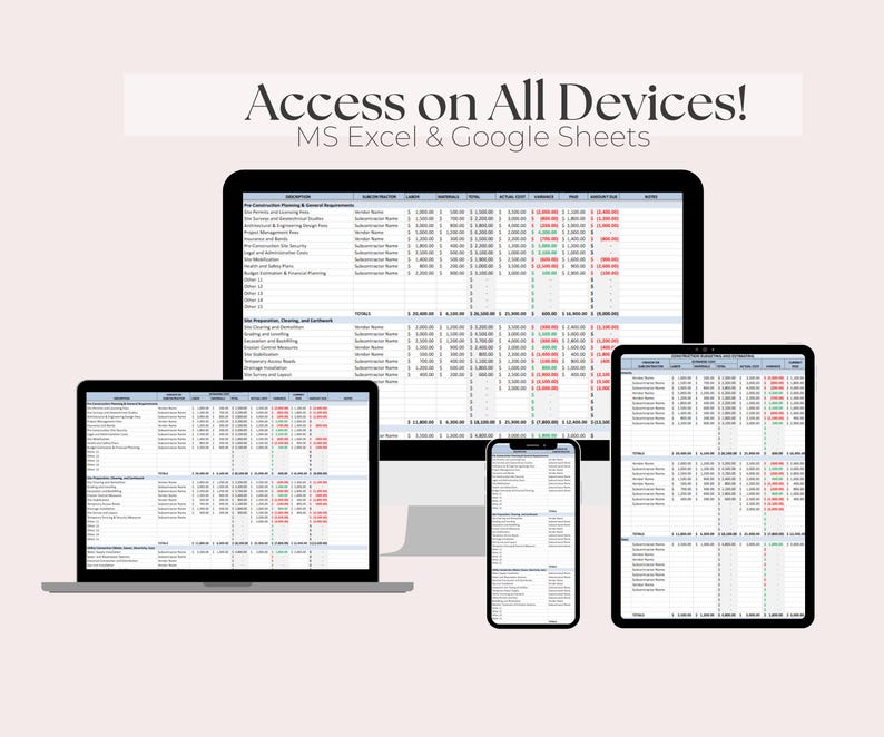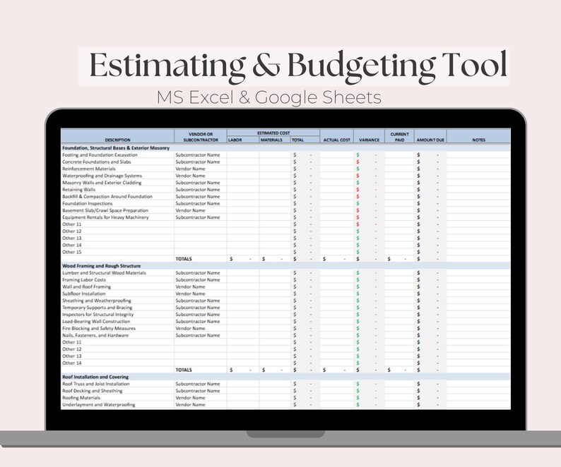 Construction Budget Template: Excel Google Sheets Cost Tracker Etsy