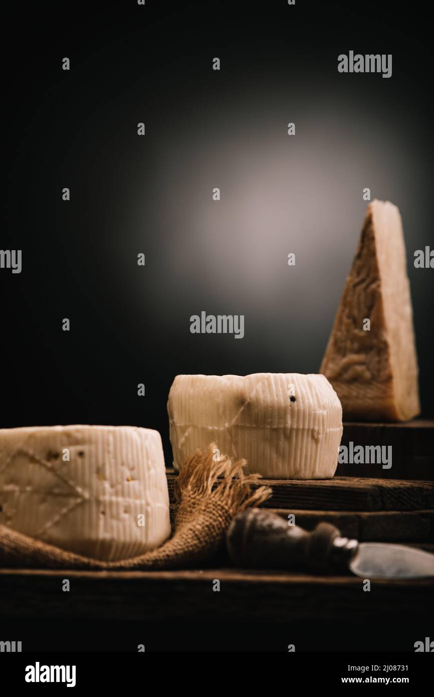 Sicilians cheeses on a black background with a place for text Close up