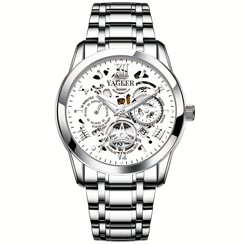 Hollow Mens Non Mechanical Watch With Steel Band Calendar Large Dial