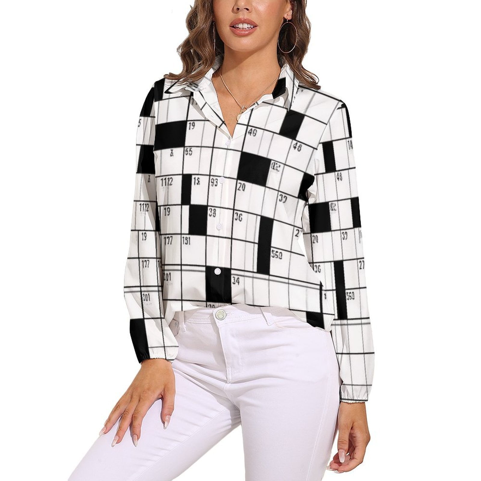 Crossword Puzzle Design(1) Vntage Casual Long Sleeve Shirt Blouse Woman