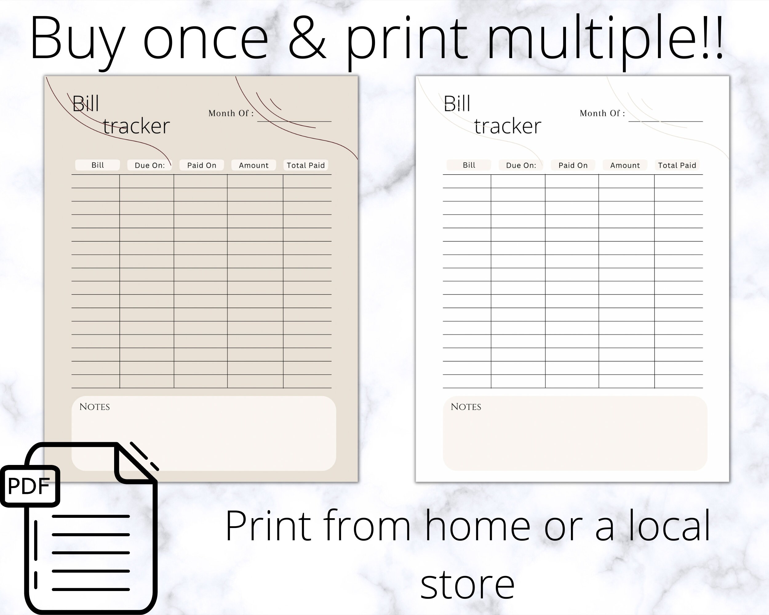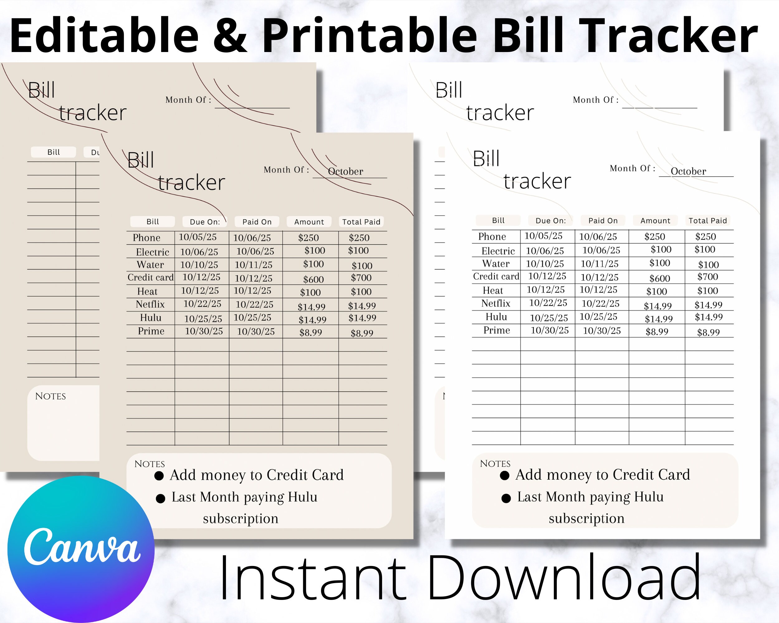 Monthly Bill Tracker Printable Editable Bill Log Template