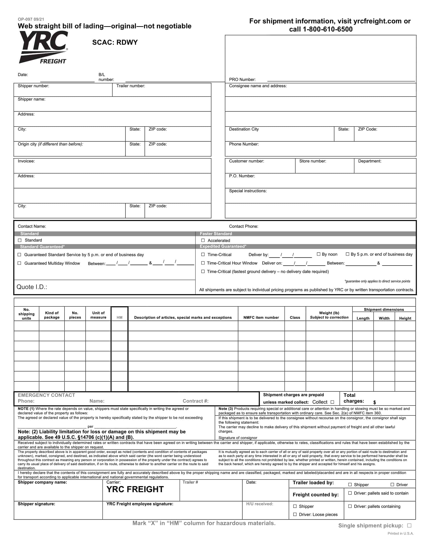 Printable Bill Of Lading Template