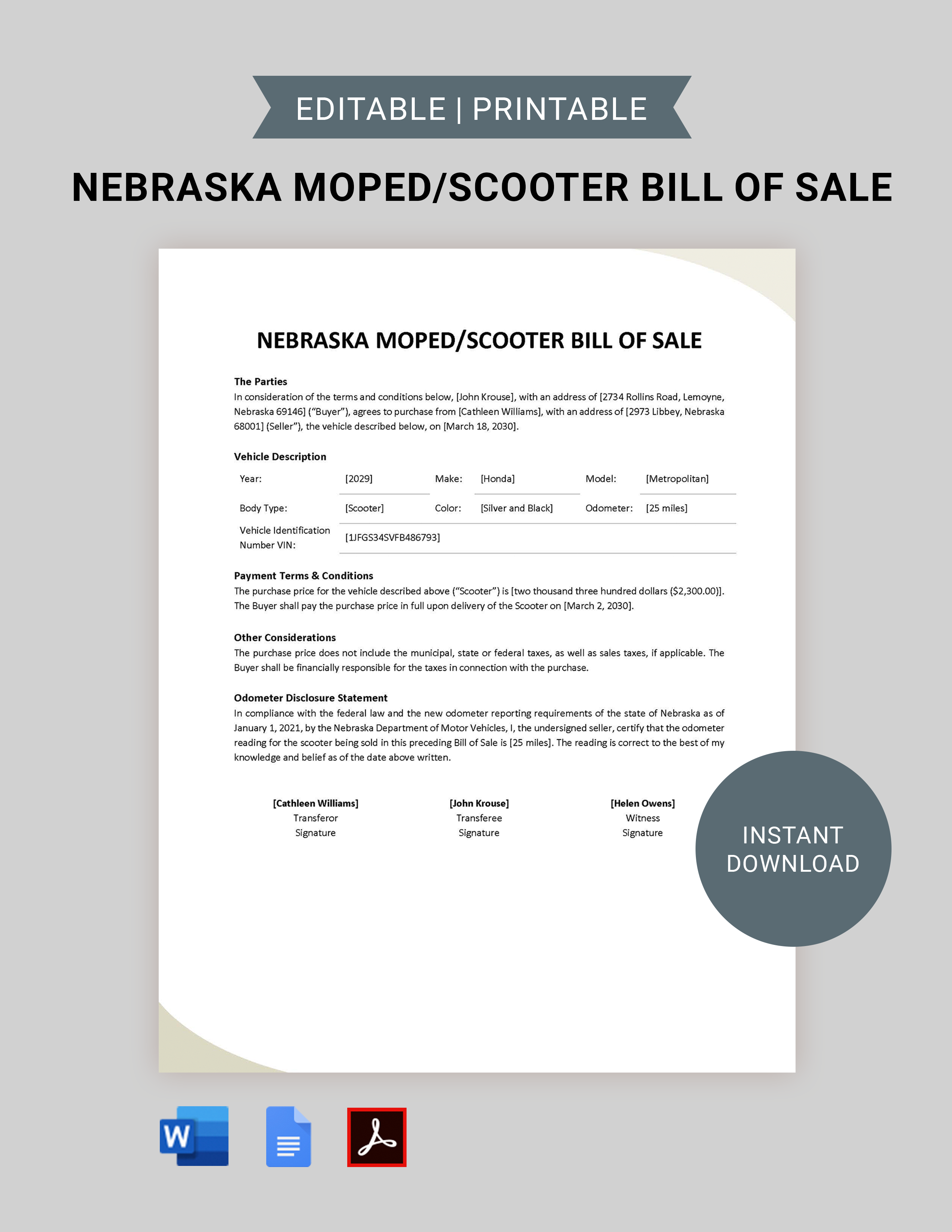 Georgia Moped / Scooter Bill of Sale Template in Word PDF Google Docs