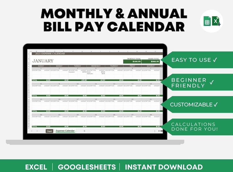 Monthly Bill Tracker Spreadsheet: Excel Google Sheets Budget Calendar
