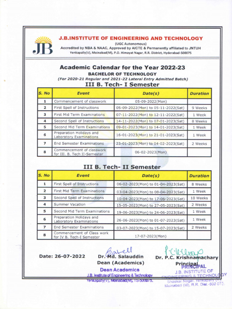 B Tech III Year Academic Calender 2022 23 PDF