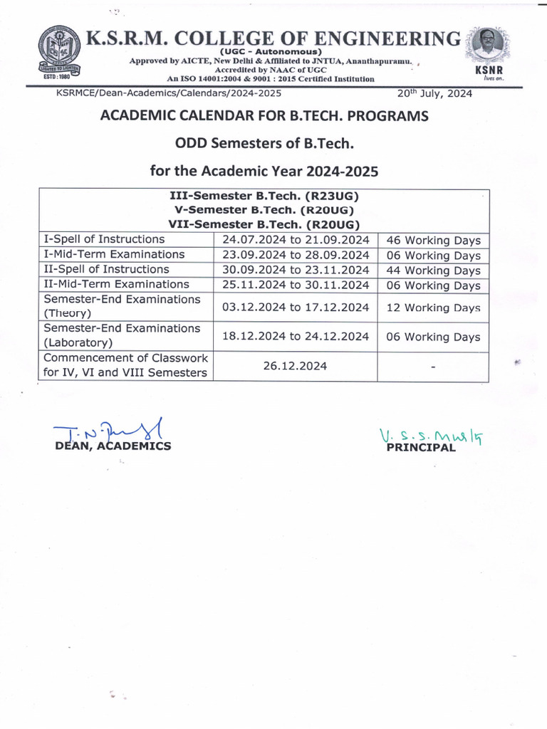 Academic Calender For BTech Programs PDF