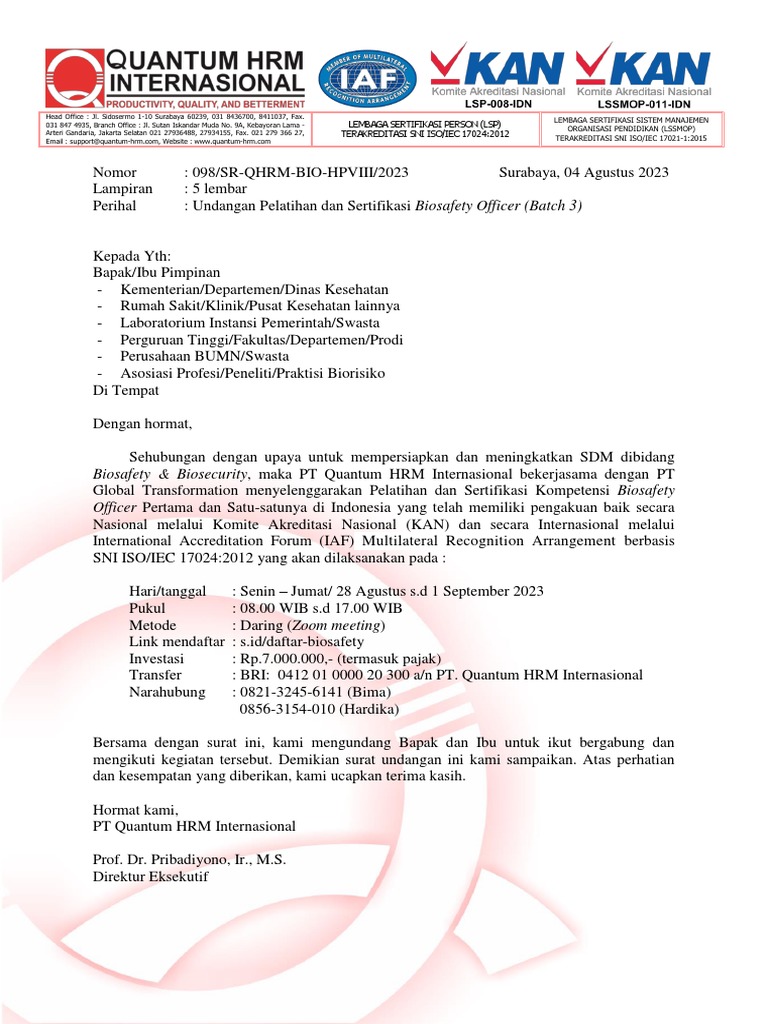 Undangan Pelatihan Dan Sertifikasi Biosafety Officer (Batch 3) PDF