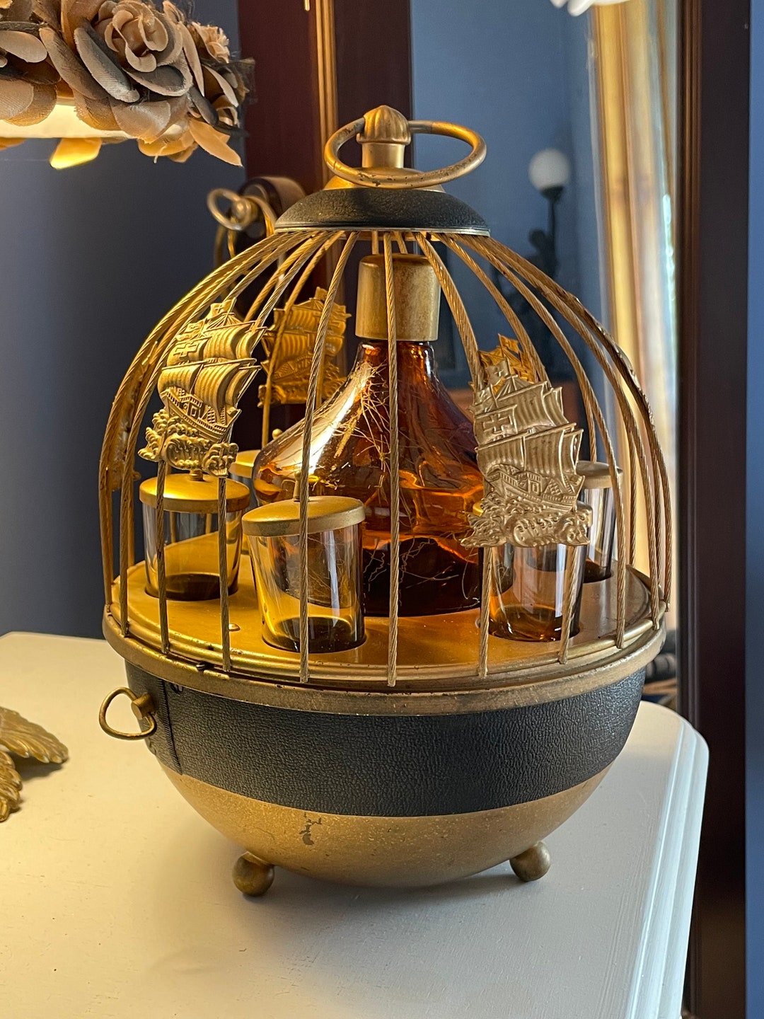 C 1960 #39 S Musical Birdcage Decanter Set Complete metal / Amber Glass