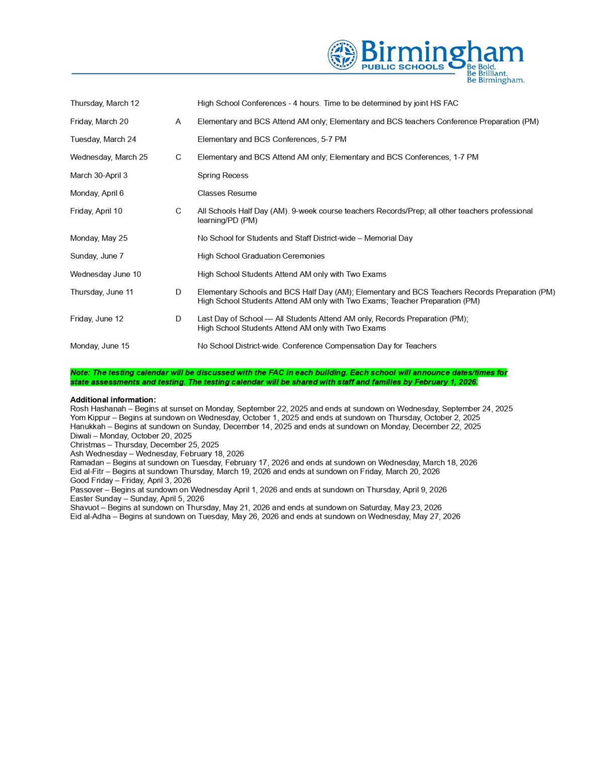 Birmingham 📅 Important Dates for the 2026 2027 School Year Planning