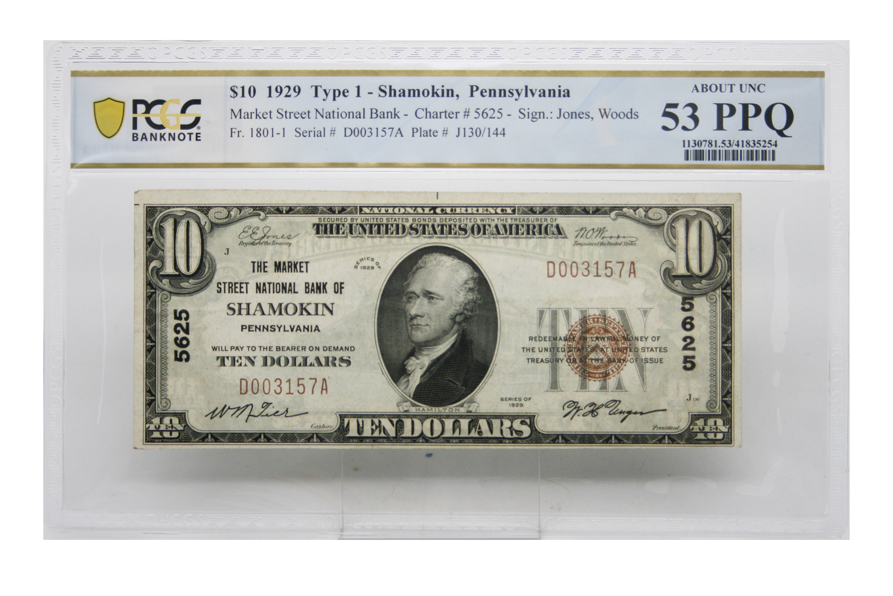 1929 $10 Type 1 Shamokin Pennsylvania Fr#1801 1 PCGS AU 53 PPQ CV